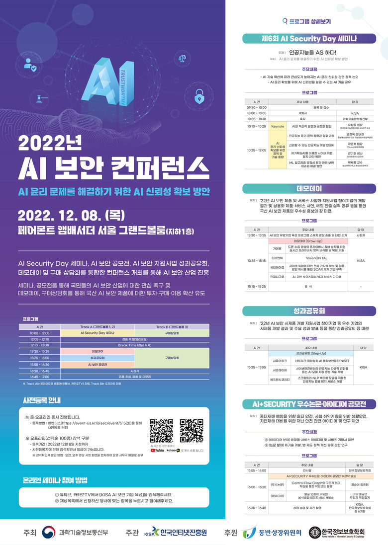[세계타임즈 백진욱 기자] 오늘 8일 한국인터넷진흥원(KISA, 원장 이원태)이 과학기술정보통신부(장관 이종호)와 함께 AI 보안 산업 진흥 및 투자 유치, 판로 개척 지원을 위해 제6회 AI Security Day, AI 보안 데모데이, 신기술 기반 보안제품 구매상담회 등 5개 행사를 통합한 ‘2022년 AI 보안 컨퍼런스’를 서울 패어몬트 앰배서더 호텔에서 오는 개최한다고 밝혔다.
