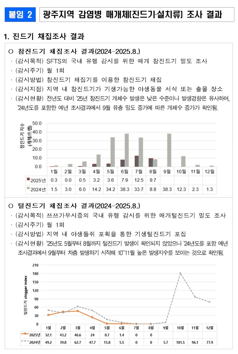 광주보건환경연구원은 매월 진드기 발생 감시를 실시하고 있다. 조사 결과, 매년 9월부터 쯔쯔가무시증을 매개하는 털진드기 유충의 활동이 활발해지고 중증열성혈소판감소증후군(SFTS)을 옮기는 참진드기 유충 밀도도 높아지는 것으로 확인됐다.