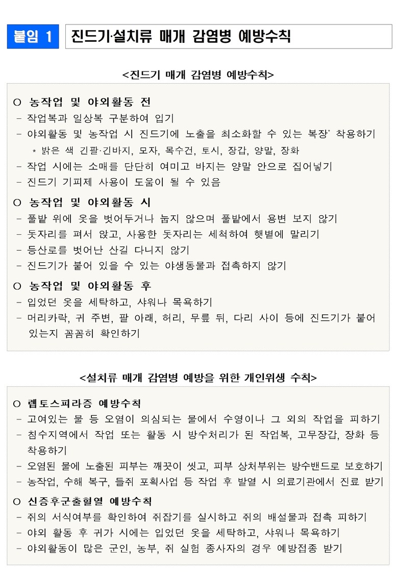 진드기 및 설치류 매개 감염병은 개인위생 관리가 필수적이다. ▲긴팔·긴바지, 모자, 양말, 장갑 등 보호 복장 착용 ▲풀밭 위에 눕거나 용변 보지 않기 ▲등산로 외 산길 이동 자제 ▲야생동물 접촉 금지 ▲야외활동 후 의복 세탁 및 샤워로 진드기 확인 ▲발열 등 의심증상 발생 때 즉시 의료기관 방문 등이 주요 수칙이다.