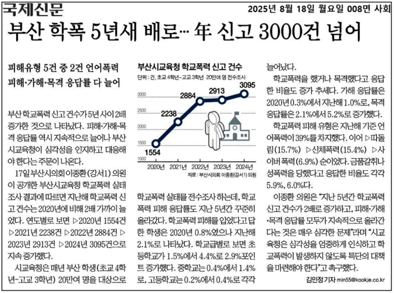 이준호 의원은 “올해 8월 17일 공개한 부산시교육청 학교폭력 실태조사 결과, 지난해 학교폭력 신고건수는 2020년에 비해 2배 가까이 늘었다*”고 말하며, “2024년 학교폭력 실태조사 결과**, 가해 학생 유형은 ‘같은 학교 학생’이 85.6%로 대부분인 것으로 나타난 만큼, 학교폭력 대응은 학교라는 공간적 범위에서 접근이 필수적이다”고 발의 취지를 설명했다.