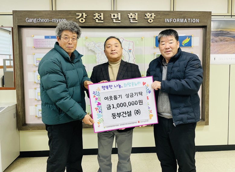 이에 배인수 강천면장은 “모두가 힘든 시기에 강천면민을 위해 따뜻한 정성을 보여주신 동부건설㈜에 진심으로 감사드린다”며, “전해주신 소중한 성금은 기탁자의 뜻을 받들어 관내 어려운 이웃들이 추운 겨울을 안전하고 따뜻하게 보낼 수 있도록 꼭 필요한 곳에 전달하겠다”고 답했다.