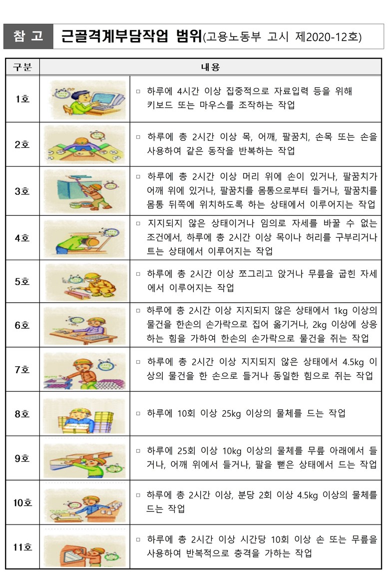 ‘근골격계 부담 작업’이란 단순 반복 또는 인체에 과도한 부담을 주는 업무와 관련해 고용노동부장관이 고시한 11개 유형의 작업으로 산업안전보건법에 따라 3년 주기로 유해 요인을 조사해야 한다.