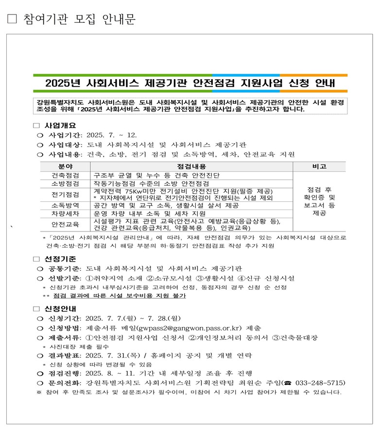 이은영 강원특별자치도 사회서비스원장은 “이번 안전점검 지원사업을 통해 종사자와 이용자 모두가 보다 쾌적하고 안전한 환경에서 사회서비스를 주고받을 수 있도록 실질적인 지원을 아끼지 않겠다”며, “도내 많은 기관들의 적극적인 관심과 참여를 기대한다”고 밝혔다.