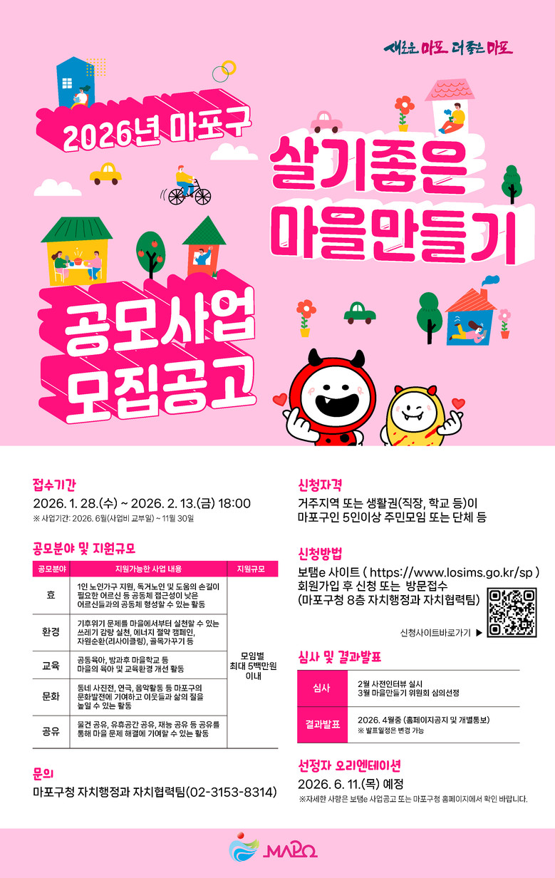 - 효·환경·교육·문화·공유 5개 분야… 팀당 최대 500만 원 지원 [마포구 세계타임즈=이장성 기자] 마포구(구청장 박강수)는 주민이 제안한 아이디어를 지원해 마을공동체 활성화를 도모하는 ‘2026년 마포구 살기좋은 마을만들기 공모사업’ 참여 대상자를 2월 13일까지 모집한다.