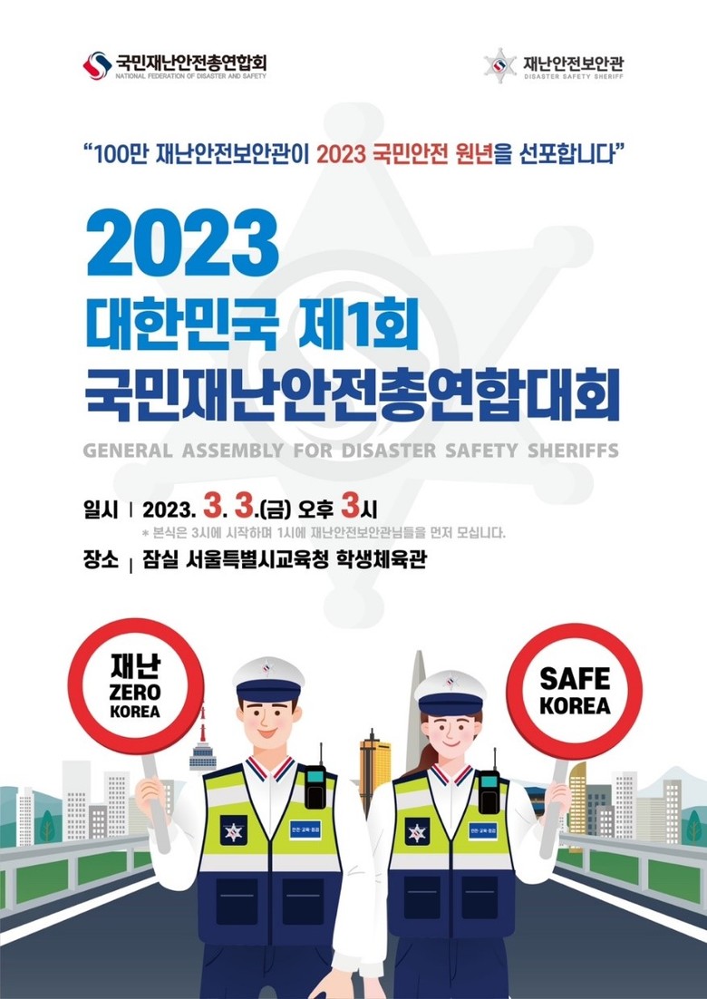 [세계타임즈 = 백진욱 기자] 3월 3일(금) 오후 1시, 서울특별시 송파구에 위치한 ‘서울특별시교육청 학생체육관’(잠실학생체육관)에서 국내 최초 국민의 안전과 재난사고 예방을 위한 ‘100만 재난안전보안관’ 출범식이 개최된다.