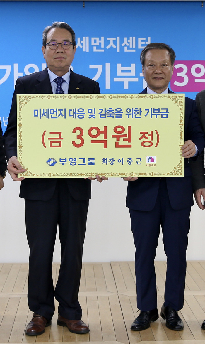 부영그룹은 이번 미세먼지 감축을 위한 기부금 기탁을 포함해 환경, 지역사회, 미래세대를 위해 집중적으로 나눔을 실천하고 있다. 지난해에는 포항 지진 피해로 보금자리를 잃은 이재민들에게 임대아파트를 제공했으며 경주 지진피해, 대구 서문시장 화재피해, 여수 수산시장 화재피해 성금 등 재난, 재해 피해가 있을 때마다 아낌없이 지원하고 성금을 기탁해 왔다.