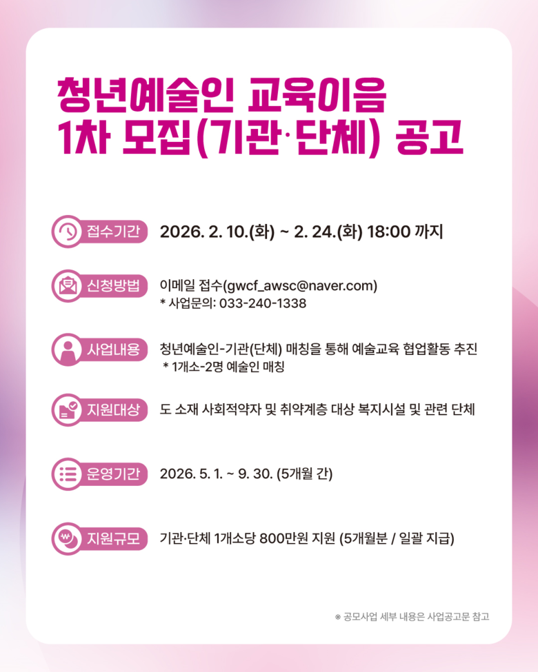 신현상 강원문화재단 대표이사는 “청년예술인 교육이음 사업을 통해 문화예술을 기반으로 한 공공 협력 모델을 지속적으로 확산할 것”이라며, “지역 청년예술인의 안정적인 활동 기반을 마련하고, 기관·단체와의 협업을 통해 지역사회에 기여하는 문화복지 사업으로 자리잡을 것”고 밝혔다.