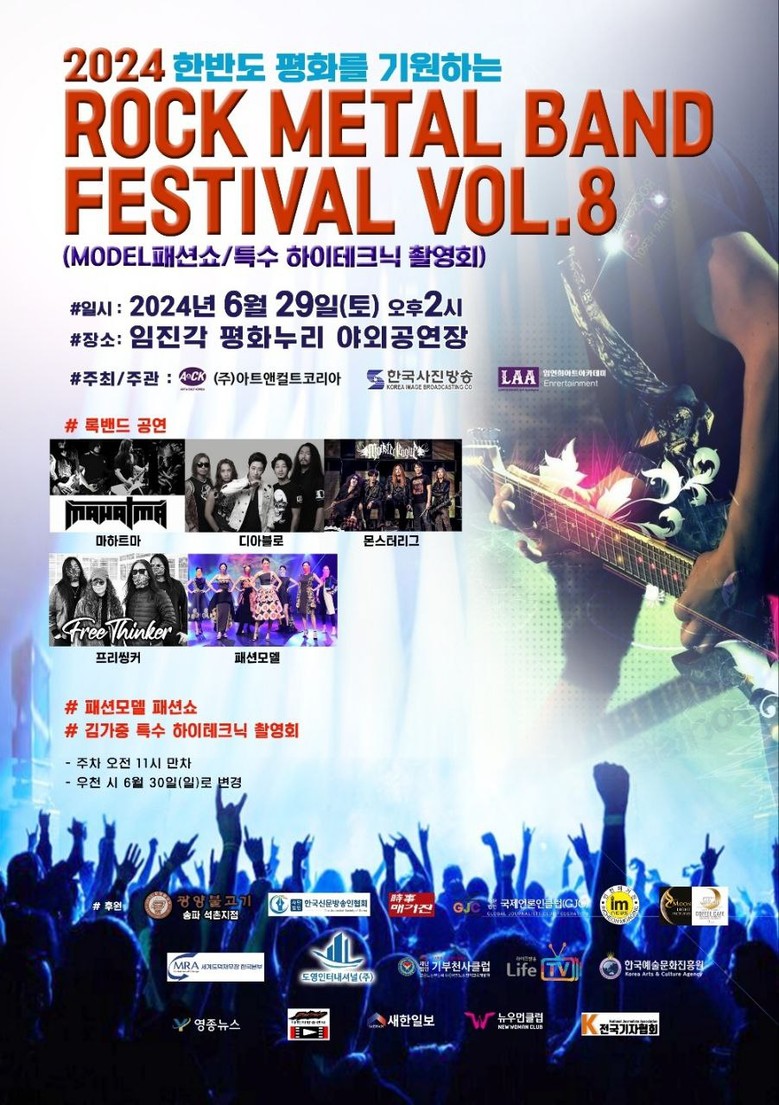 오는 29일 토요일 한반도 평화를 기원하는 예술인들이 모여 경기도 파주 임진각 평화누리 야외공연장으로 발걸음을 향했다. 2024 한반도 평화 기원 락 페스티벌이 'ROCk METAL BAND FESTIVAL VOL.8'을 주제로 진행될 예정이다.