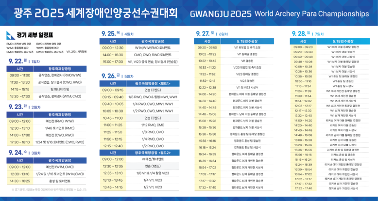 지난 12일 성황리에 폐막한 ‘광주 2025 현대세계양궁선수권대회’에 이은 연속 개최로, 광주는 이탈리아 토리노와 네덜란드 스헤르토헨보스에 이어 전 세계에서 세 번째로 세계양궁선수권대회와 세계장애인양궁선수권대회를 연이어 개최하는 도시가 됐다. 세계장애인양궁선수권대회 국내 개최는 2007년 청주 이후 18년 만이다.