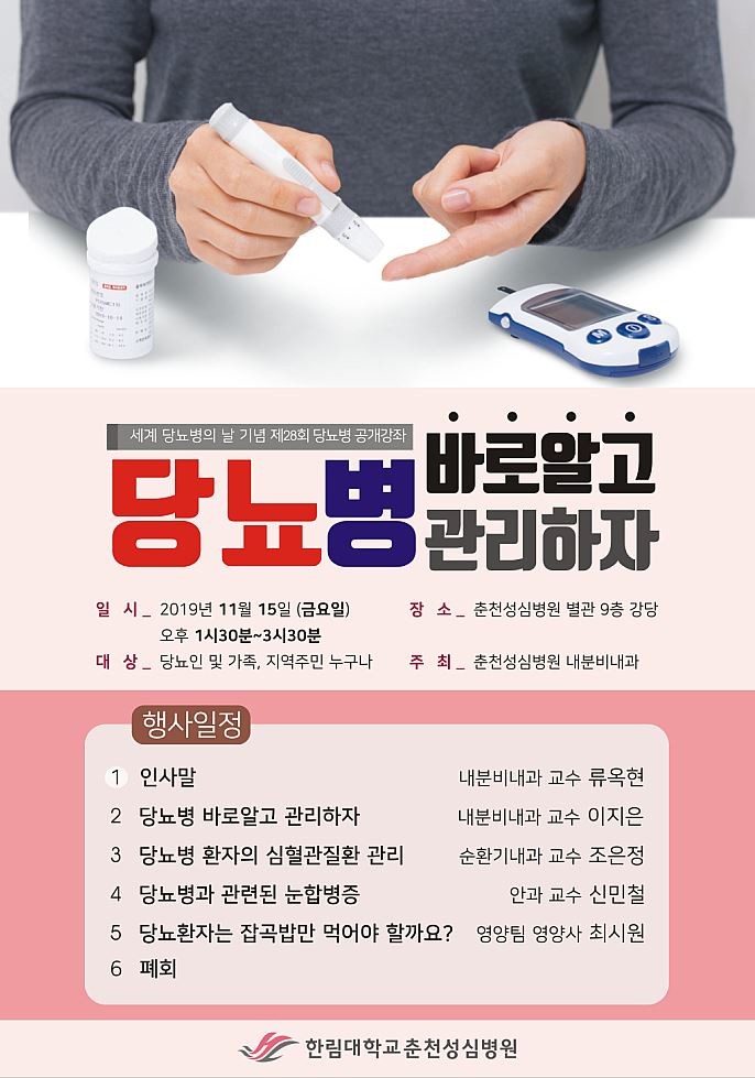 류옥현 한림대춘천성심병원 내분비내과 교수는 “당뇨병은 평생 관리가 필요한 만성질환으로 혈당조절이 부적절한 경우 뇌·심장·신장·발·눈 등에 합병증을 초래할 수 있다”며 “이번 강좌를 통해 지역주민들이 당뇨병 및 합병증을 예방하기 위한 방법을 알아보는 시간이 됐으면 한다”고 말했다.