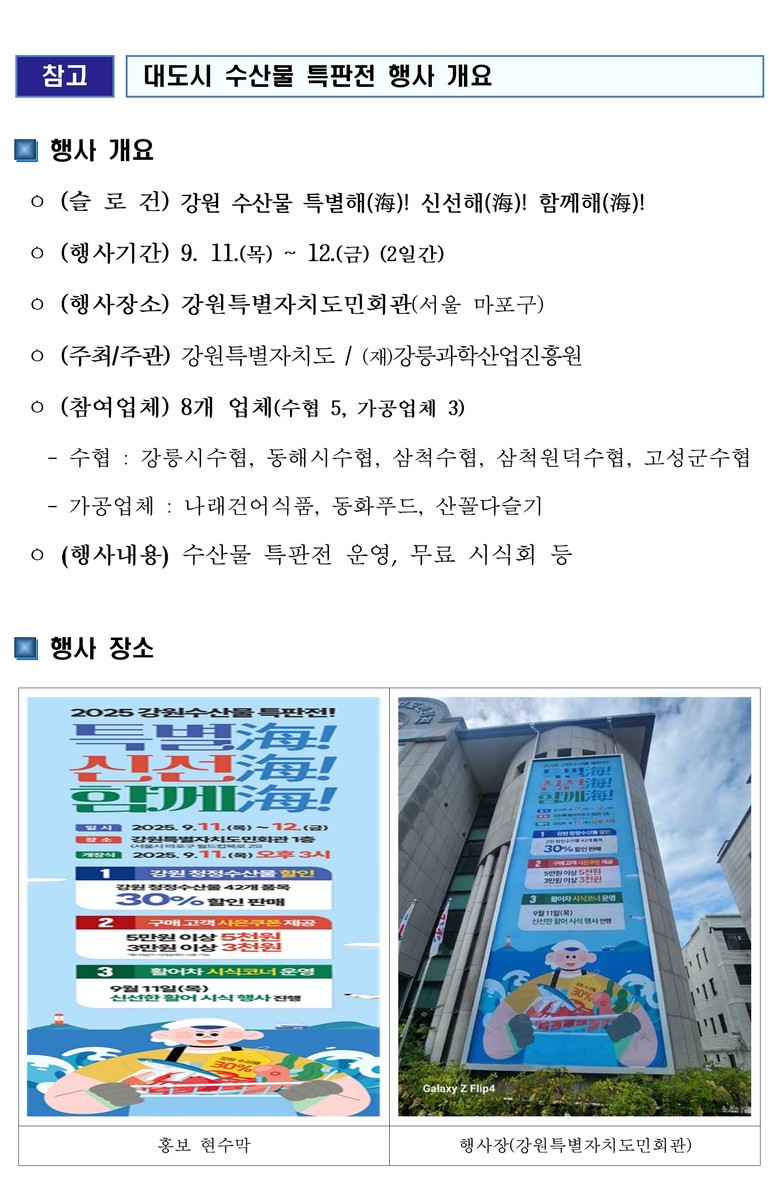 강원특별자치도 관계자는 “이번 특판전은 명절을 앞두고 수도권 시민들에게 청정 동해 수산물의 우수성을 직접 체험할 기회를 제공하는 동시에, 도내 수협과 가공업체의 판로 확대에도 실질적인 도움이 될 것”이라며, “앞으로도 특판전을 정례화해 강원 수산물의 안정적 판매 기반을 마련하고, 생산자와 소비자가 함께 상생할 수 있도록 최선을 다하겠다”고 말했다.