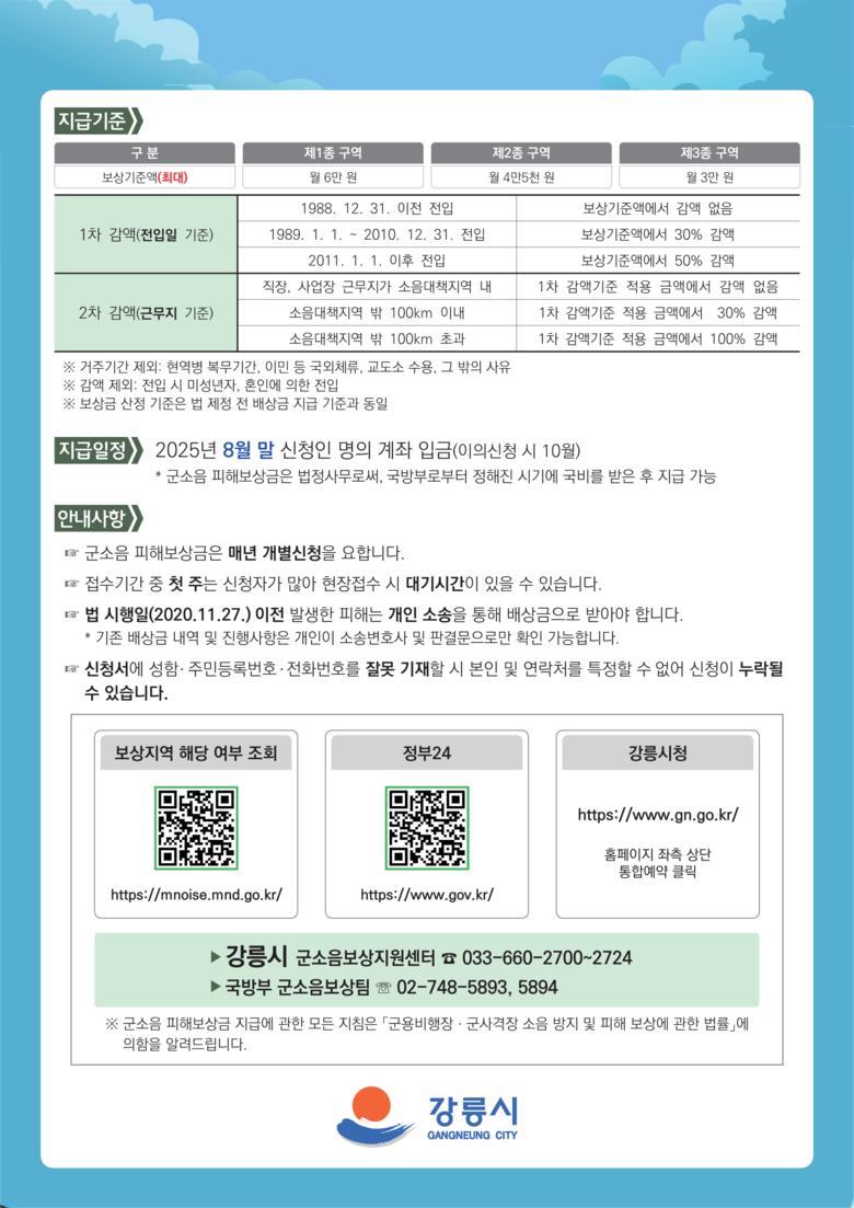 강릉시 관계자는 “군소음 피해보상이 보상금 신청부터 지급까지 불편 없이 진행될 수 있도록 최선을 다하겠다.”라고 말했다.