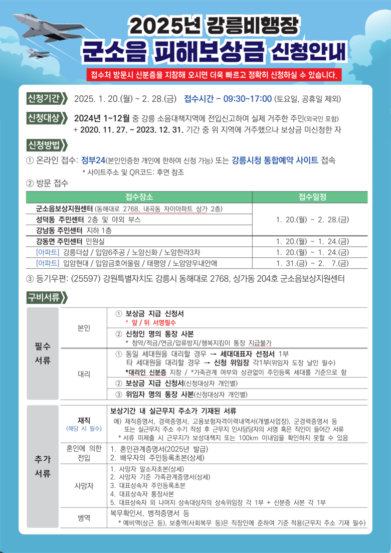 금년도 접수대상 보상금은 전년도 2024년 1월 1일부터 12월 31일까지 1년분으로, 소음대책지역에 주민등록지를 두고 실제 거주한 사실이 있는 주민을 대상으로 하며 외국인도 포함된다.