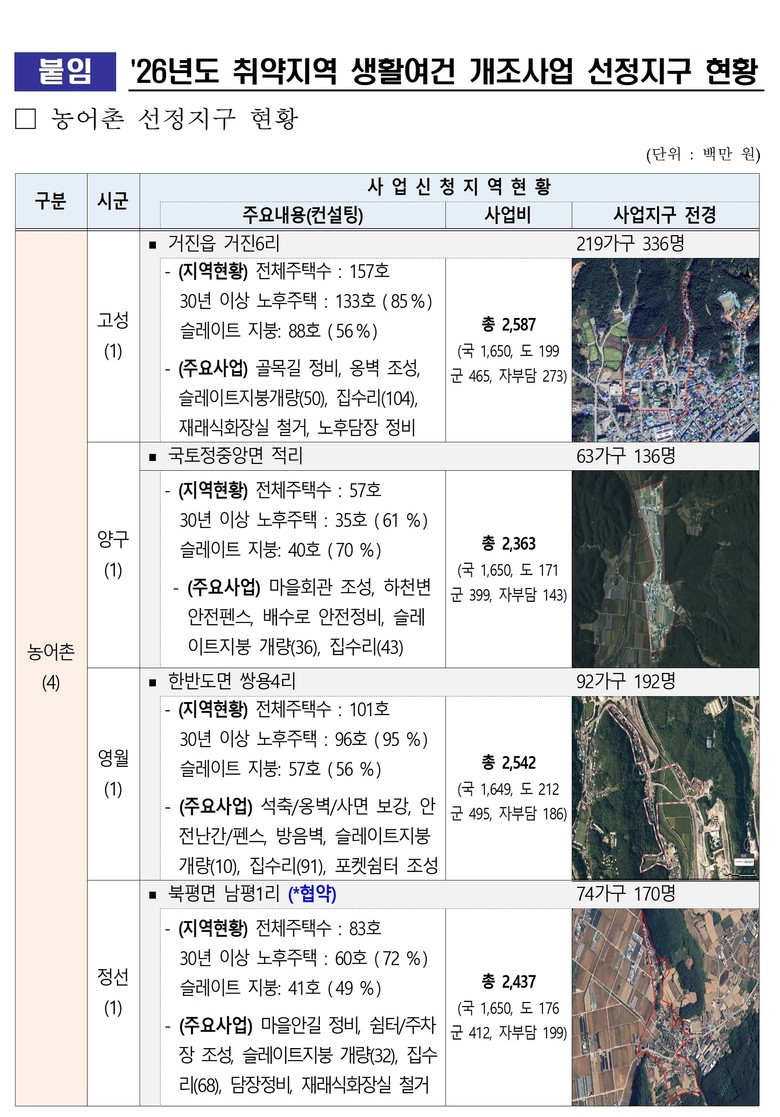 김주용 강원특별자치도 지역소멸대응정책관은 “취약지역 생활여건 개조사업은 가장 기초적인 생활 인프라조차 부족한 지역에 실질적인 도움을 주는 대표적인 생활밀착형 정책”이라며, “앞으로도 도민 삶의 질 향상과 주거환경 개선을 위해 최선을 다하겠다”고 밝혔다.