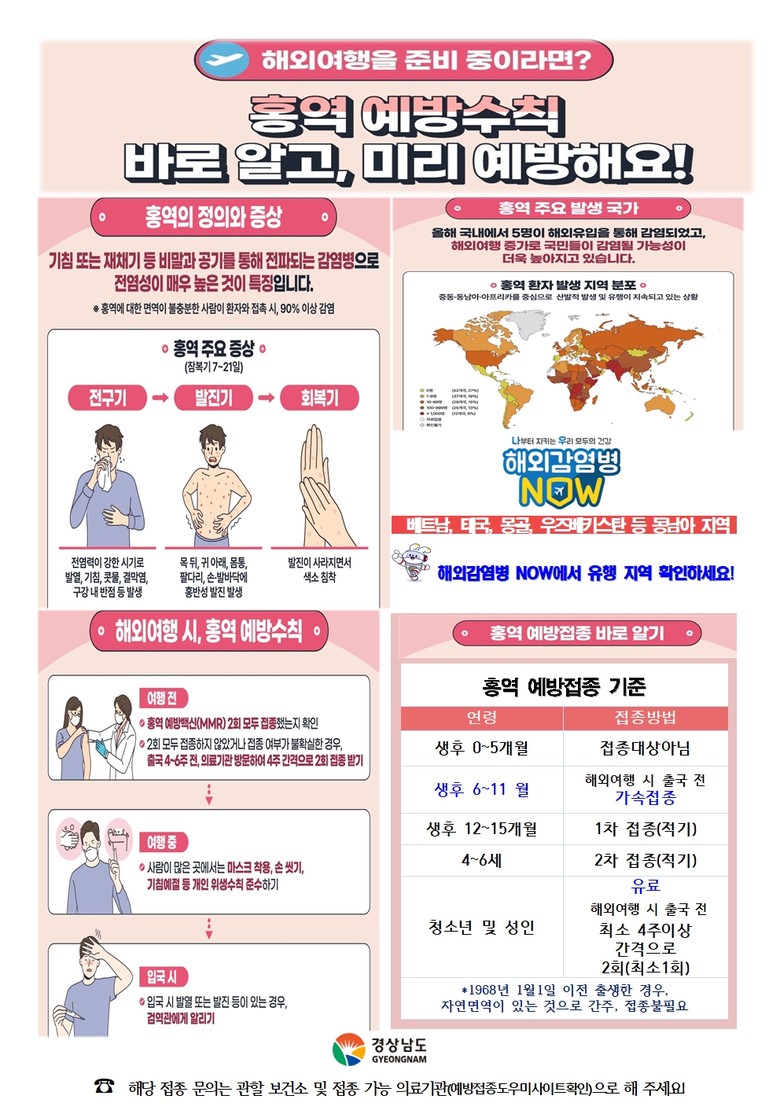 노혜영 경남도 감염병관리과장은 “여름방학과 휴가철을 맞이하여 해외여행을 계획한다면 여행 전에 홍역 예방접종(12~15개월 및 4~6세 총 2회) 여부를 확인하여 출국 전 접종을 완료해 주시길 바란다”면서, “해외여행 중 마스크 착용 및 예방수칙을 준수하고 해외여행 후 3주 내 발열, 발진, 기침 등 의심 증상이 나타난다면 즉시 의료기관을 방문해 진료받도록 권고한다”라고 밝혔다.