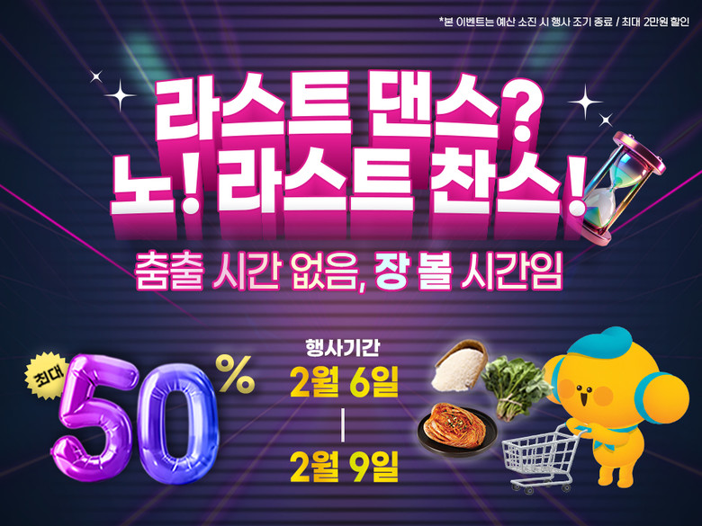 이번 기획전은 명절 직전까지 바쁜 일상으로 장보기에 여유가 없었던 소비자를 겨냥해 “라스트 댄스? 노! 라스트 찬스!_춤출 시간없음, 장 볼 시간임”이라는 유쾌한 콘셉트로 기획됐으며, 설 상차림에 필요한 고흥산 농수축특산물을 최대 50% 할인된 가격으로 선보인다.