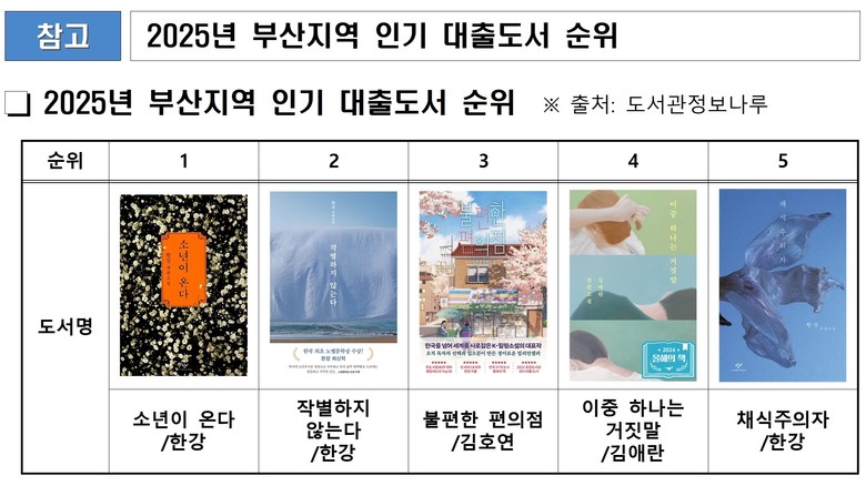 한편, 도서관 빅데이터 분석 플랫폼 '도서관 정보나루'에 따르면, 2025년 부산에서 가장 많이 대출된 도서는 한강 작가의 『소년이 온다』로 나타났다.