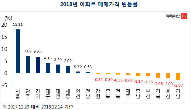 2018년 아파트 매매가격은 전국이 8.67% 오른 가운데 지역별로는 서울이 18.11% 변동률을 기록하며 가장 높은 상승률을 보였다. 경기도는 분당, 판교, 광교, 광명, 과천, 용인 등 서울 접근성이 좋고 새 아파트가 많은 지역을 중심으로 매매가격이 강세를 보이며 6.68% 상승했다. 지방 광역시 에서는 광주가 가장 높은 상승률을 보였다. 남구 봉선동, 서구 치평동 등 학군이 좋은 지역에 투자수요가 몰리면서 7.02% 상승했다. 이어 대구가 4.18% 상승했다. 신규 아파트 공급이 줄었고 학군과 거주여건이 좋은 수성구와 재개발 재건축 사업이 활발한 중구가 가격 상승을 이끌었다. 대전도 서구와 유성구 등 주거환경이 좋고 세종시 접근성이 좋은 지역을 중심으로 강세를 보이면서 3.49% 상승했고 세종도 분양시장 활황에 힘입어 3.02% 상승했다.