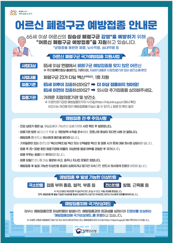폐렴구균 예방접종은 23가 다당 백신(PPSV23)으로, 65세 이상의 경우 평생 1회 접종으로도 침습성 폐렴구균 감염증(균혈증 동반한 폐렴, 뇌수막염, 심내막염 등)에 대해 50~80%의 예방효과를 기대할 수 있다.