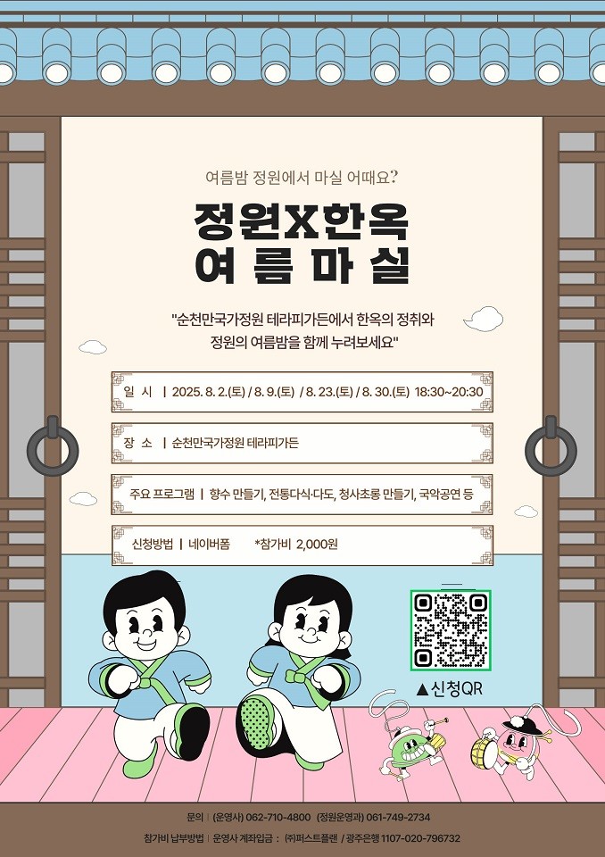「여름마실」은 한옥에서 즐기는 여름 정원을 콘셉트로 순천만국가정원 내 테라피가든에서 진행된다. 프로그램은 ▲향 테라피 ▲전통 다과 시식 ▲청사초롱 만들기 ▲국악 공연 ▲달 포토존 등 오감을 통해 감각적 치유를 받을 수 있는 프로그램으로 구성됐다.