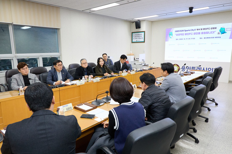 [용인시 세계타임즈=송민수 기자] 용인특례시의회 의원연구단체 ‘Sports City(스포츠시티) 8’(대표 임현수)은 17일 시의회 대회의실에서 체육진흥과 및 용인FC 관계자들과 간담회를 열고, 용인FC 창단 준비 현황을 점검하며 향후 운영 방향에 대해 논의했다.