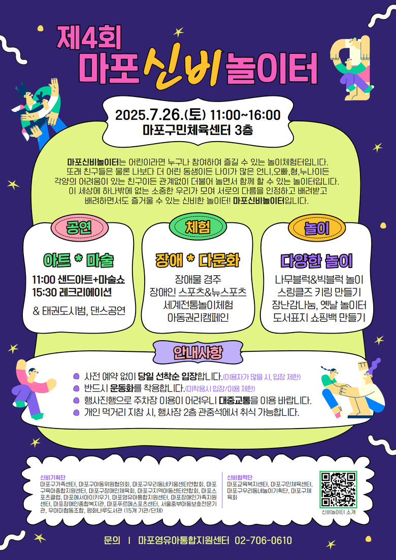- 샌드아트·마술쇼로 여는 축제, 청소년 공연도 다채롭게 구성 [마포구 세계타임즈=이장성 기자] 마포구(구청장 박강수)는 7월 26일 토요일 오전 11시부터 오후 4시까지 마포구민체육센터에서 아동을 위한 통합놀이문화축제 ‘제4회 마포 신비놀이터’를 개최한다.