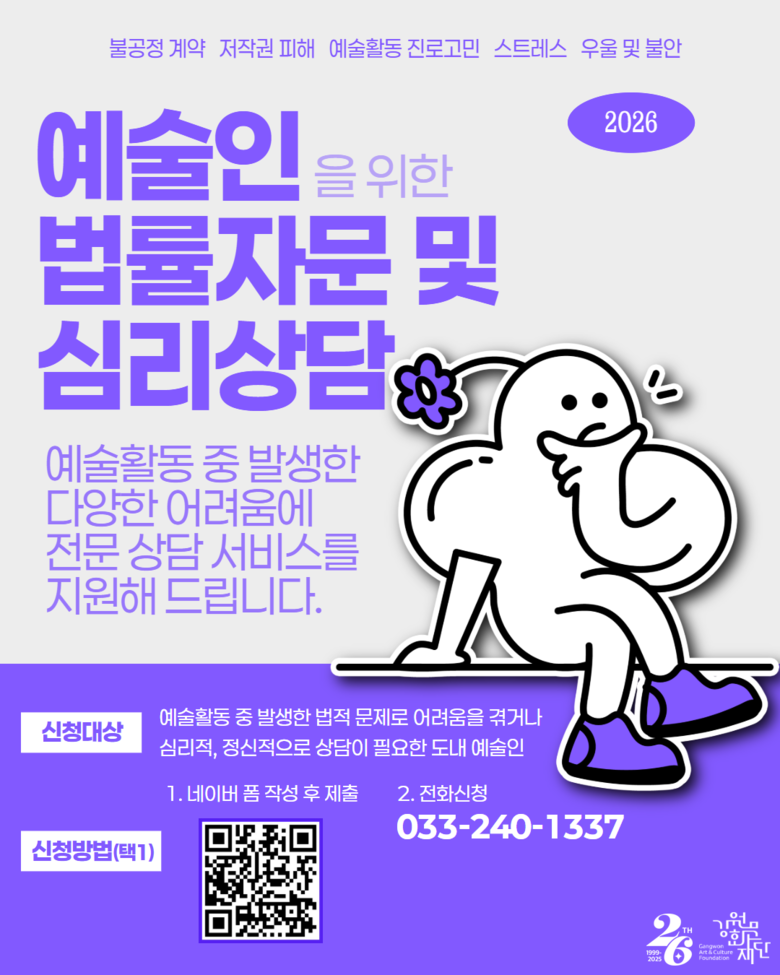 한편, 강원문화재단은 도내 예술인의 권익 보호와 창작 환경 조성을 위해 법률 및 심리상담 지원 서비스도 운영하고 있다. 강원지방변호사회와 협력하여 검증된 전문가의 법률 자문을 지원하고, 보건복지부 주관 자격을 갖춘 전문 심리상담센터와 협력하여 도내 예술인의 심리 상담을 지원하고 있다. 재단은 향후 도내 심리상담센터와의 협력을 지속적으로 확대해 나갈 계획이다.