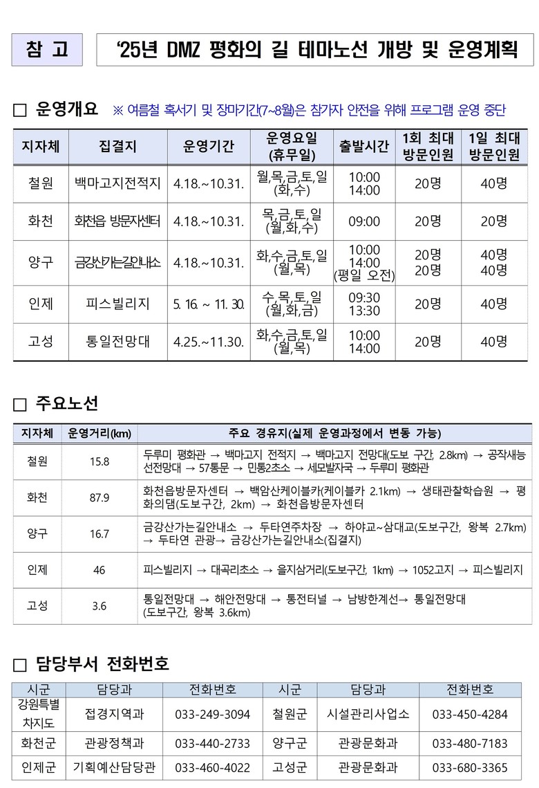 * 양구군: 강원피스투어협동조합 033-255-2333 (수 자체운영)