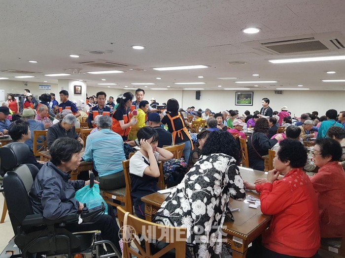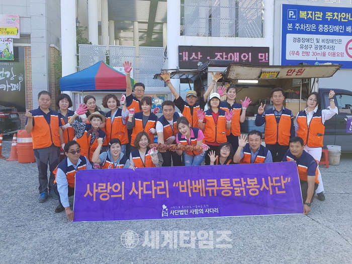 [대전=세계타임즈 이장성 기자] 다양한 봉사활동을 하고 있는 5천명 봉사 빅밴드 사랑의 사다리 밴드(리더 이정제)는 28일 유성구 장애인 복지관에서 오전 11시부터 대전광역시 지체장애인협회 유성구지회(지회장 박종해)의 월례회의에 참석한 200여명의 회원들에게 바베큐 통닭 봉사로 훈훈한 이웃사랑을 전했다.