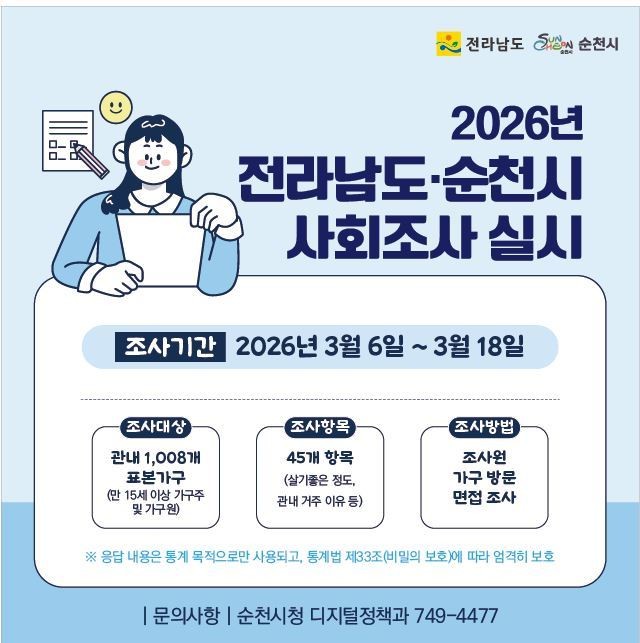 조사 대상은 국가데이터처에서 선정한 순천시 1,008 표본가구의 만 15세 이상 가구주 및 가구원이며, 조사원이 직접 가구를 방문하여 조사를 진행한다.