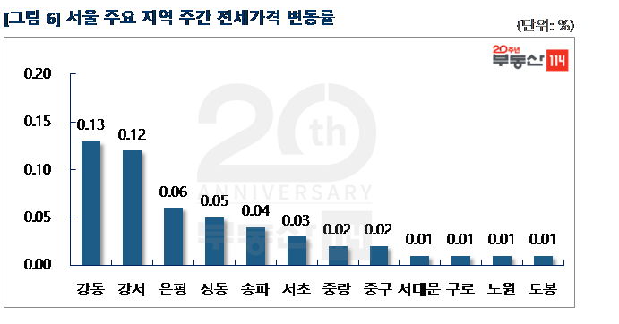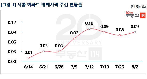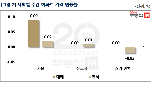 부동산114(www.r114.com)에 따르면 금주 서울 아파트값은 0.09% 올라 지난 주(0.08%) 대비 상승폭이 커졌다. 재건축이 0.14%, 일반아파트가 0.09%의 변동률을 기록했다. 입주 10년 이내의 재고아파트 주요 단지들을 중심으로 매물 부족 현상이 나타났고, 상대적으로 저평가된 재건축 단지들도 상승세를 이끌었다. 신도시와 경기ㆍ인천의 매매가격은 별다른 움직임 없이 보합(0.00%)을 기록했다.
