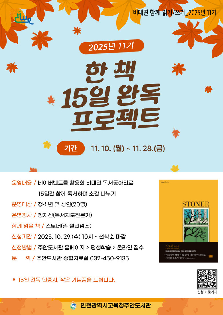참여 신청은 10월 29일(수) 오전 10시부터 주안도서관 누리집(https://lib.ice.go.kr/juan)에서 가능하며, 자세한 사항은 종합자료실(☎032-450-9135)로 문의하면 된다.