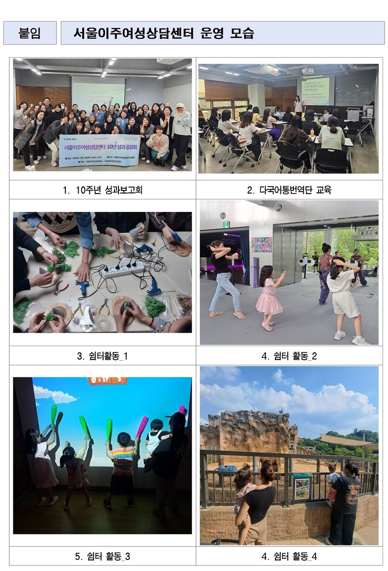 아울러 시는 센터를 통해 새롭게 법원 재판, 실제 변호사 상담사례 등 현장 모니터링을 통해 이주여성 활동가가 법.제도적 개선 사항을 발굴하게 하고, 이들의 상담 역량을 강화하기 위한 ‘법률 모니터링 지원단 활동사업’을 시범 실시한다. 서울시의 폭력피해 예방사업의 일환으로 센터 내에 대학.지역사회 유관기관 등과 연계하여 ‘찾아가는 성폭력 상담센터’를 운영하여 유학생 등의 폭력 피해를 더욱 선제적으로 예방할 계획이다.