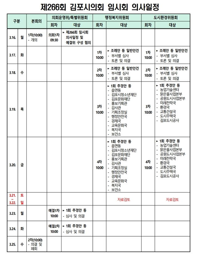 [김포시 세계타임즈=김민석 기자] 김포시의회(의장 김종혁, 이하 시의회)는 오는 3월 16일부터 3월 25일까지 10일간의 일정으로 제266회 임시회를 열고, 조례안과 기타안 등 일반안건을 비롯해 2026년도 제1회 추가경정예산안을 심사·의결한다.