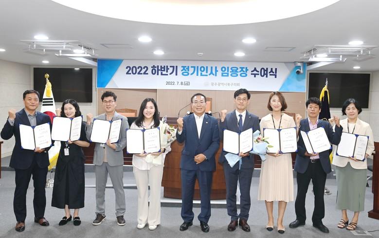 [세계타임즈=광주 손권일 기자] 광주 북구의회(의장 김형수)가 지난 8일 의회 소속 직원에 대한 2022년 하반기 정기인사에 따른 임용장 수여식을 시행했다.