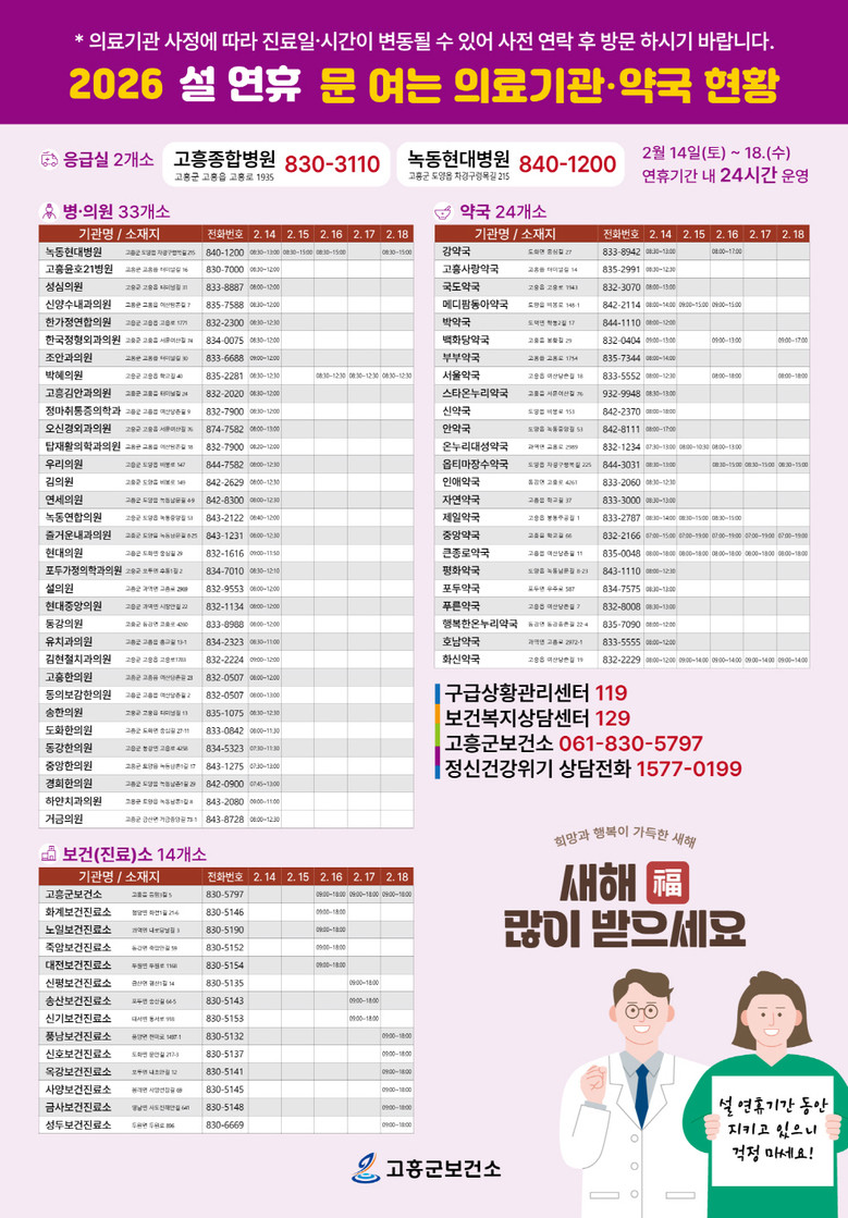 한편, 설 연휴 기간 진료가 가능한 의료기관과 약국 정보는 고흥군보건소 누리집이나 응급의료포털(www.e-gen.or.kr)에서 확인할 수 있으며, 고흥군 보건소(☎830-5797)로 문의하면 자세히 안내받을 수 있다.