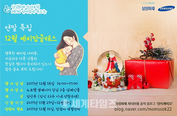 [세계타임즈 이채봉 기자]삼성화재는다음달 18일 오후 2시 서울 강남구 노보텔앰배서더 호텔에서 연말특집'맘쏙케어22예비맘클래스'를진행한다고 28일 밝혔다.