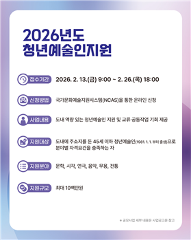 ・ 향후 공동프로젝트로 확장 가능한 지원 체계 구축 [강원도 세계타임즈=김민석 기자] 강원문화재단(대표이사 신현상)은 도내 청년예술인들의 창작활동을 지원하고, 예술인 간 교류 및 공동작업 기회를 제공하기 위해 「2026년 청년예술인지원」 공모를 추진한다.