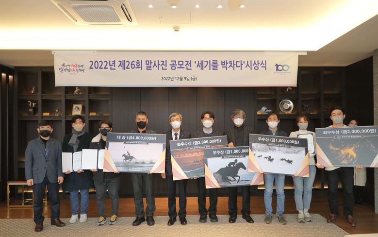 [세계타임즈 = 심하린 기자] 한국마사회(회장 정기환)가 한국 경마 100년을 기념하여 지난 4월부터 시작한 ‘제26회 말사진 공모전’ 수상작이 12월 9일(금)부터 말박물관 기획전시실에서 선보인다. ‘세기를 박차다’라는 타이틀로 진행된 이번 공모전에는 디지털카메라와 스마트폰으로 촬영한 작품 총 1,014점이 출품됐으며, 외부 교수와 사진기자가 포함된 심사위원들의 1, 2차 심사를 거쳐 모두 35점이 수상의 영광을 안았다.