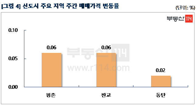 신도시는 △평촌(0.06%) △판교(0.06%) △동탄(0.02%) 등 일부 지역 빼고는 보합 수준에 머물렀다. 명절 연휴 영향으로 수요자 유입이 뜸했다. 평촌은 평촌동 초원대원과 초원대림, 초원5단지LG 등이 500만원-1,000만원 올랐다. 판교는 판교동 판교원마을9단지가 1,000만원 상승했다. 동탄은 청계동 시범계룡리슈빌, 시범예미지, 시범반도유보라아이비파크1차 등이 500만원-750만원 올랐다.