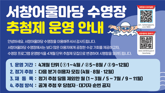 당첨자는 28일 17시까지 결제를 완료해야 하며, 신청 등록을 마친 후 1월부터 4월까지 4개월간 수영장을 이용할 수 있다.