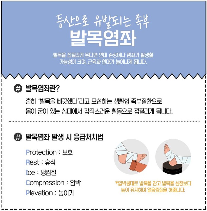 이렇게 되다 보니 준비 없이 이뤄진 산행, 무리한 등산 등은 부상을 일으킬 수 있다. 대표적인 것이 발목 염좌다. 흔히 말하는 ‘발목이 삐었다’는 증상이다. 갑자기 산을 오르다 다리에 힘이 빠져 발목이 꺾이게 되고 이 과정에서 발목 인대가 손상되는 염좌가 발생하게 된다. 발목 염좌가 생기면 PRICE를 기억해야 한다. 먼저 환부를 보호(Protection)하고 충분히 휴식(Rest)을 취하면서 냉찜질(ICE)을 하고 난 뒤 환부를 압박(Compression)해야 한다. 그리고 안정적인 곳에서 환부를 최대한 들어올려야(Elevation)한다.