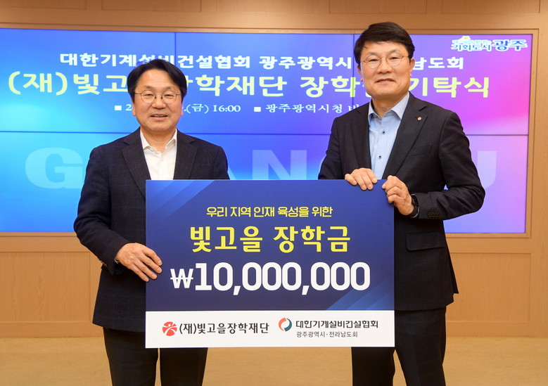 [광주 세계타임즈=손권일 기자] (재)빛고을장학재단(이사장 강기정 광주광역시장)은 29일 시청 비즈니스룸에서 대한기계설비건설협회 광주광역시·전라남도회(회장 전상철)가 빛고을장학금 1000만원을 기탁했다고 밝혔다.
