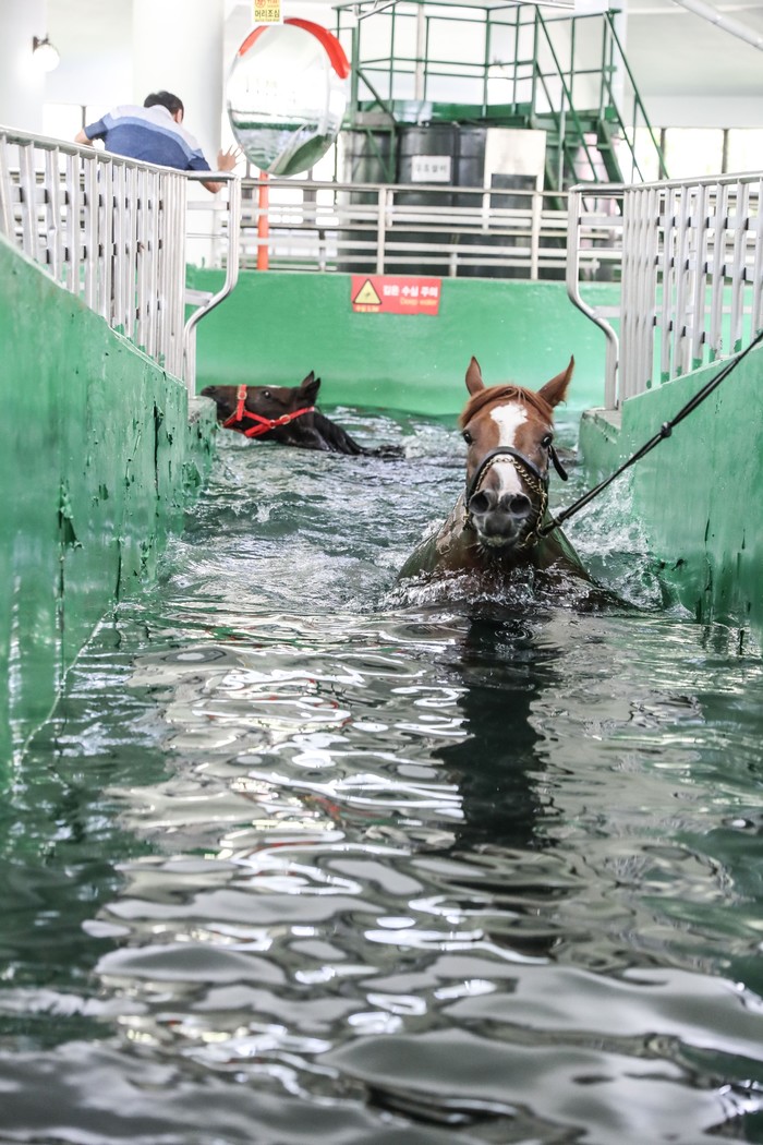 [세계타임즈 김인수 기자] 지난 3월 18일 서울 한국마사회(회장 김낙순) 과천경마공원에 경주마 수영장이 개장했다. 개장 첫날부터 경주마들이 거친 숨을 내쉬며 줄줄이 수면을 가리는 이색 풍경이 펼쳐졌다. 경주마들을 위한 전용 수영장이 국내에 3개소나 있다는 사실을 아는 사람은 많지 않다. 하지만 말 수영은 오랜 역사를 지닌 말 훈련법이며 현재는 경마를 시행하는 대부분의 국가에서 시행할 정도로 그 효과가 상당하다 인정받고 있다.