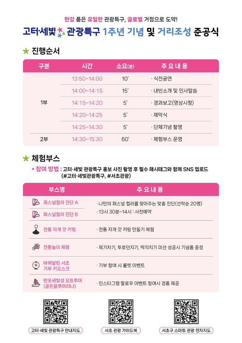 체험부스는 현장 참여형 이벤트로 운영되며 방문객은 #고터·세빛 관광특구, #서초관광 등 필수 해시태그와 함께 관광특구 홍보사진을 SNS에 업로드하면 누구나 참여할 수 있어 행사 현장의 참여도와 관광특구 홍보 효과를 동시에 높일 수 있을 것으로 기대된다.