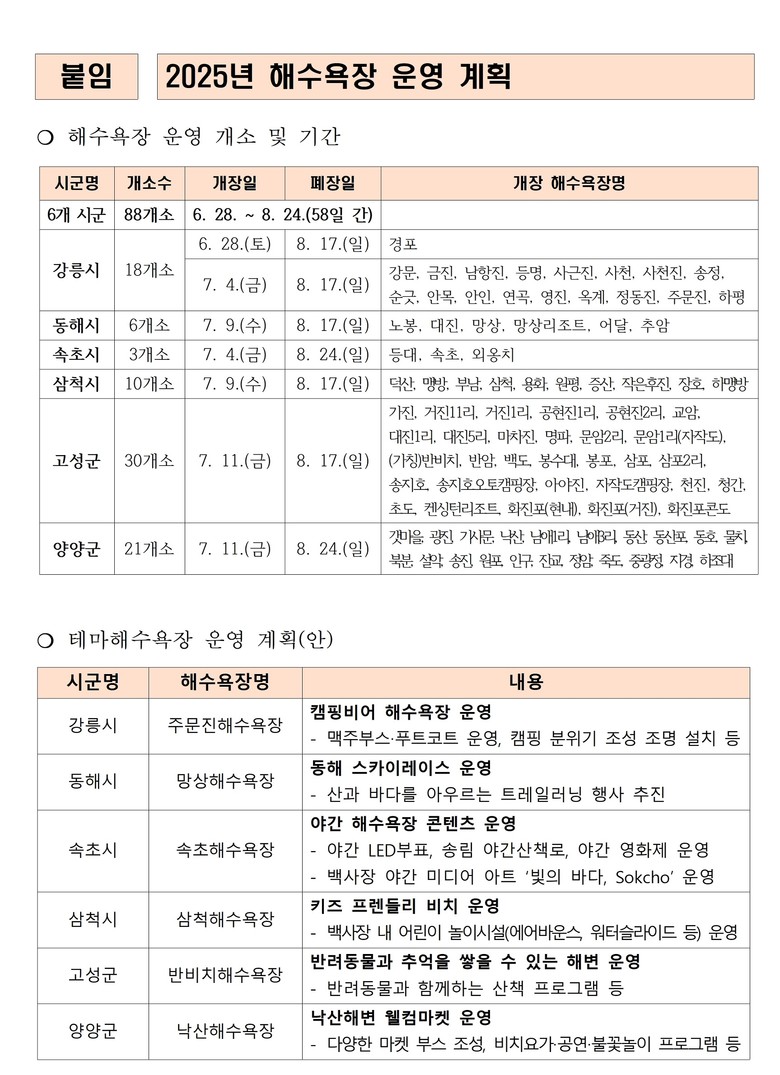 특히, 올해 해수욕장은 6월 28일 경포해변을 시작으로 8월 24일까지 도내 6개 시군, 88개 해수욕장이 개장한다. 현장 안전요원 배치, 해파리 방지망 설치 등 안전조치를 더욱 강화하고, 반려동물 전용 해변, 가족친화 해변, 야간 콘텐츠 해변 등 특화 테마 해변도 운영된다.