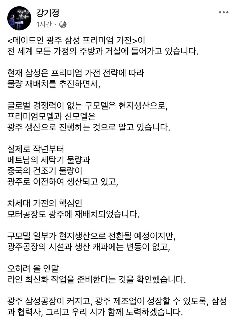 한편, 강기정 광주시장은 이날 사회관계망서비스(SNS)인 페이스북에 “삼성전자 광주사업장이 커지고, 광주 제조업이 성장할 수 있도록 삼성전자와 협력사, 그리고 광주시가 함께 노력해 나갈 것”이라며 “메이드인 광주 삼성 프리미엄 가전이 글로벌 경쟁력을 갖춰 전 세계 모든 가정의 주방과 거실에 들어갈 수 있도록 적극 협력하겠다”고 전했다.