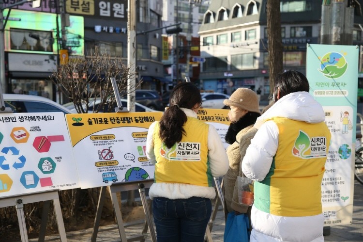 한편에선 봉사단은 탄소중립 홍보부스를 준비해 시민과 상인들에게 재활용품 무인회수 등 새로운 분리수거 방법과 탄소중립포인트제 등을 알리며 참여한 시민에게는 다육이 화분을 선물했다.