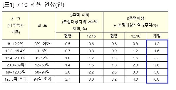 현행 일반 0.5%~2.7% 세율을 0.6%~3%로 인상하고, 3주택 이상 및 조정대상지역 2주택에는 0.6~3.2% 세율을 1.2%~6%로 인상한다. 이는 지난해 12.16대책에서 인상키로 한 세율(일반 0.1%p~0.3%p, 3주택 이상 및 조정대상지역 2주택 0.2%p~0.8%p)보다 월등히 높은 수준이다.