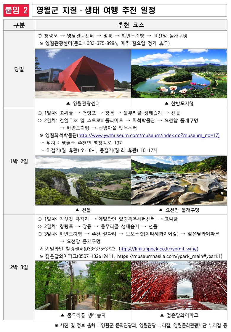 한편, 오는 4월 25일부터 27일까지는 단종의 넋과 충신들의 충절을 기리는 영월의 대표 향토문화제인 ‘제58회 단종문화제’가 청령포와 장릉 일대에서 개최된다. 축제 기간에는 강원고생대 국가지질공원 홍보·체험 부스도 함께 운영되어 청령포를 포함한 영월의 지질자원과 역사적 가치를 더욱 깊이 있게 체험할 수 있다.